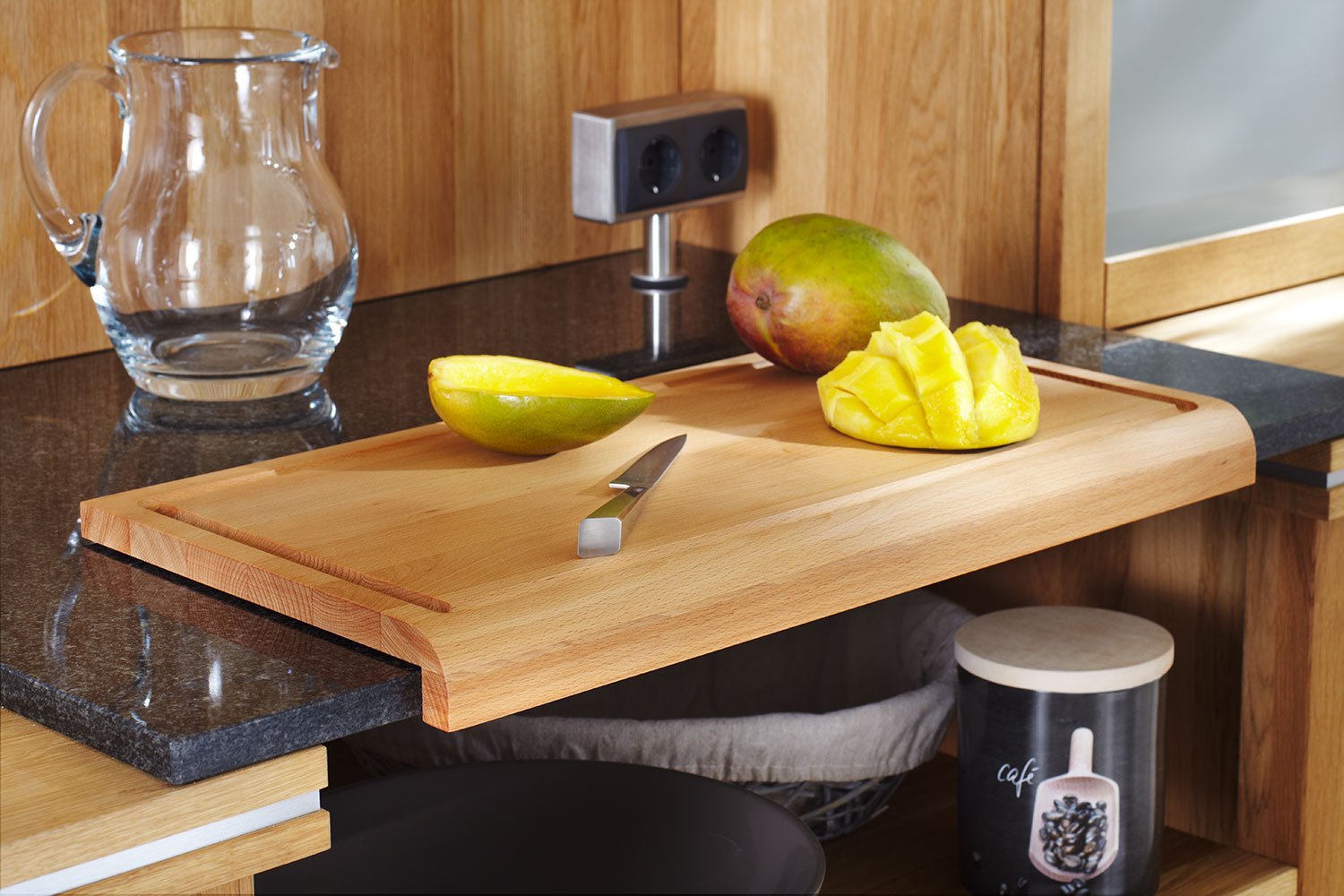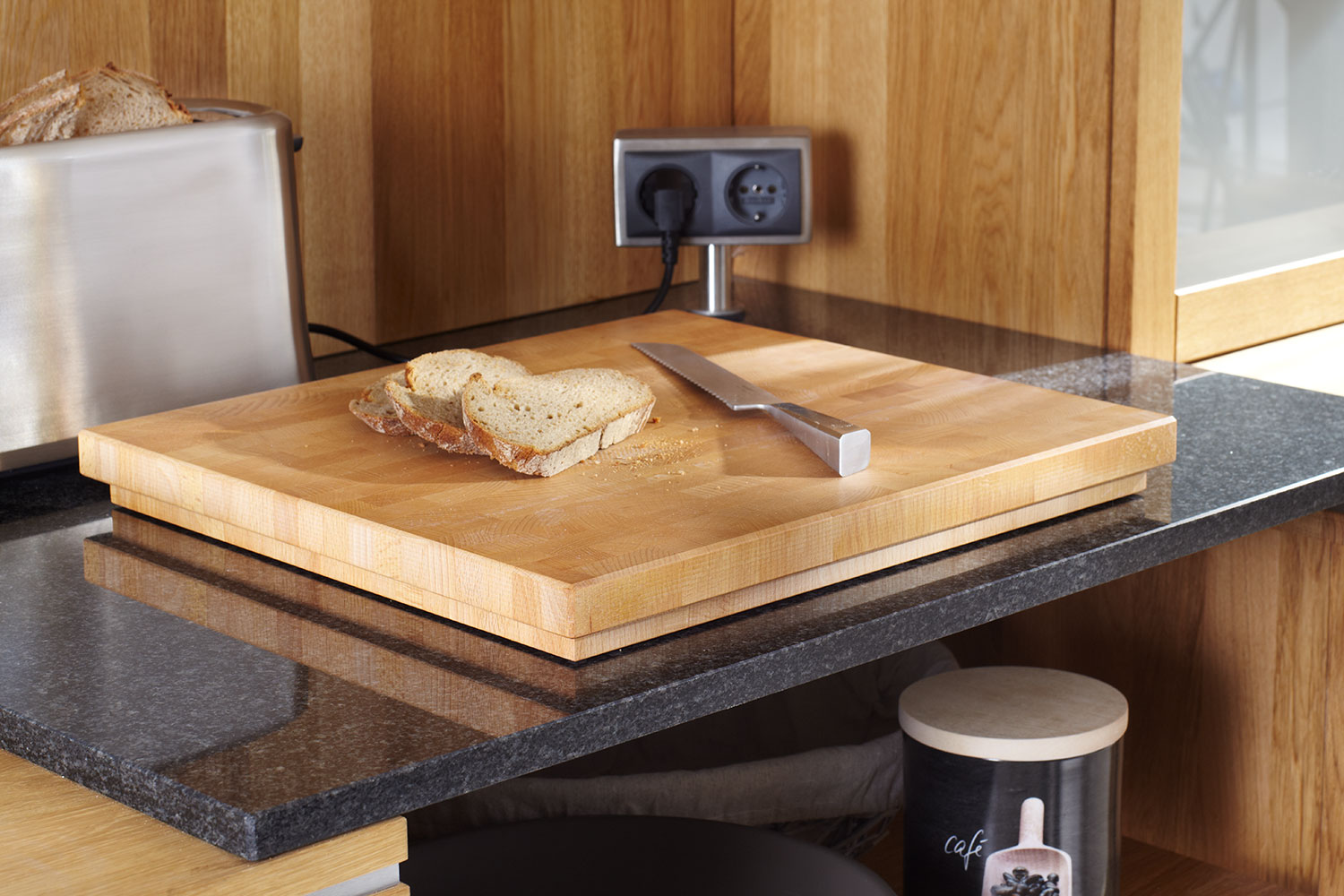 Wie wär´s mit einem annex Massivholz Werkbrett? Das Werkbrett mit Anlegekante kann auf jede Arbeitsplatte gelegt werden. Es besteht aus massivem Buchenholz, hat eine eingefräste Saftrille – und ist rutschfest durch Gumminoppen.