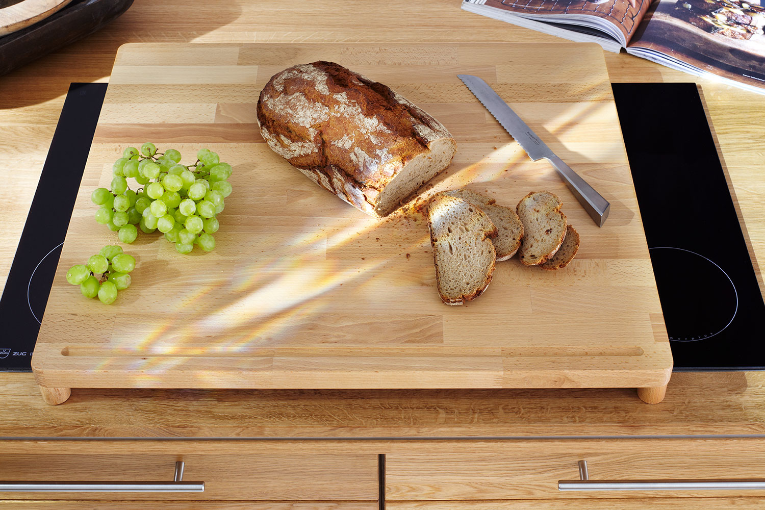 Das annex Massivholz Kochbrett. Dank seiner 4 Holzfüße „thront“ es wunderbar über allen 600 mm breiten Standard-Kochflächen. Und bietet eine ideale zusätzliche Arbeitsfläche über dem Kochfeld: Zum Hacken, Kneten, Schneiden, Tranchieren und und und