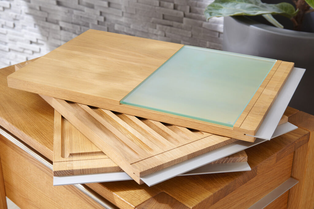 Massivholz Schneidebrett-Set. 1 Schneidebrett mit Saftrille, 1 Brotschneidebrett und 1 Käsebrett mit Glasplatte – mehr Brett geht kaum. Alle in feinstem Massivholz Buche oder Eiche mit Aluminium-Griffleiste.