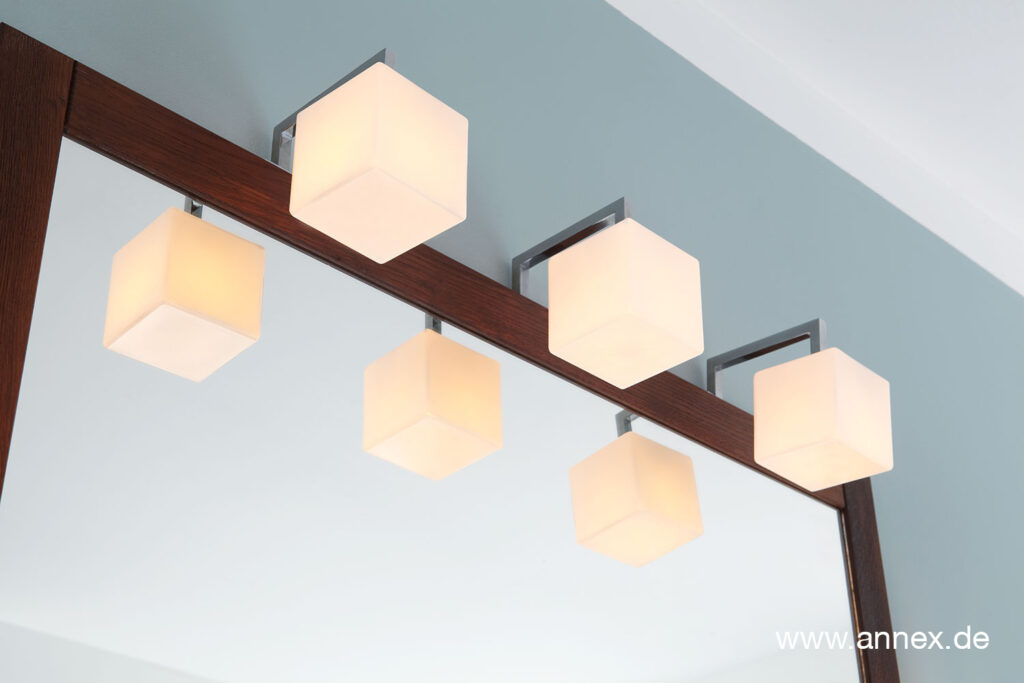 Die Würfel sind gefallen: Die Halogenlampen mit dem passenden Spiegel im Massivholzrahmen sind einfach bildschön.