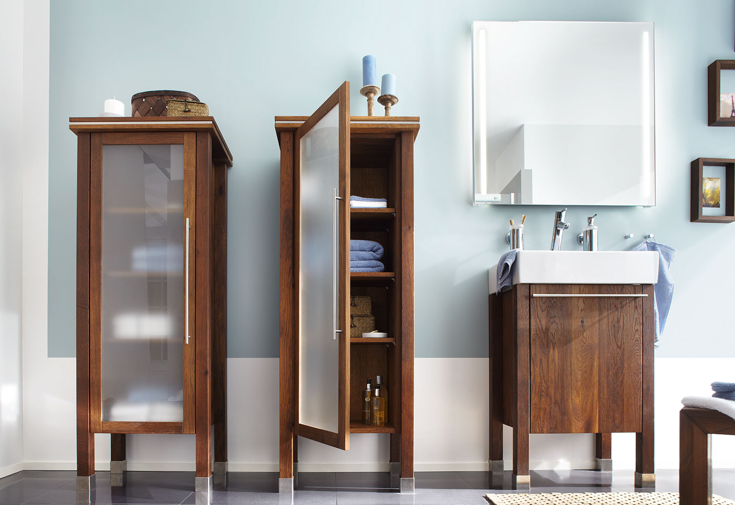 Auch wenn es mal feucht wird, bleiben unsere Massivholzmöbel fröhlich. Ganz gleich, ob die markanten Badvitrinen oder