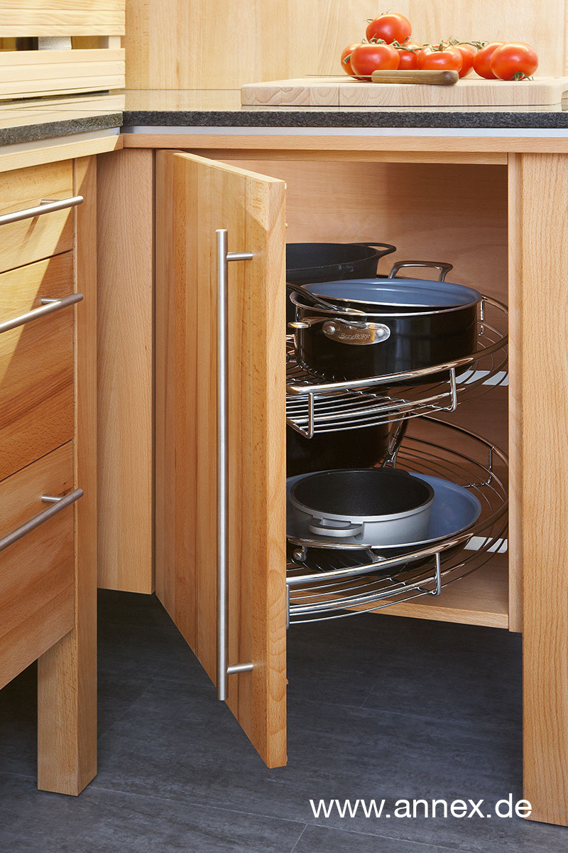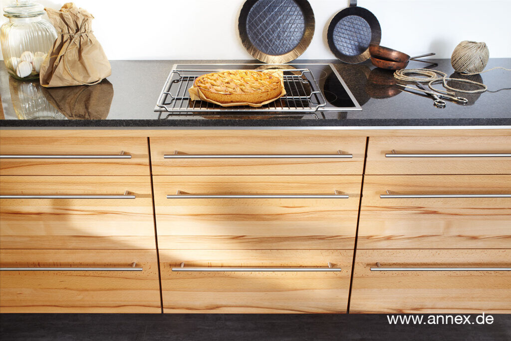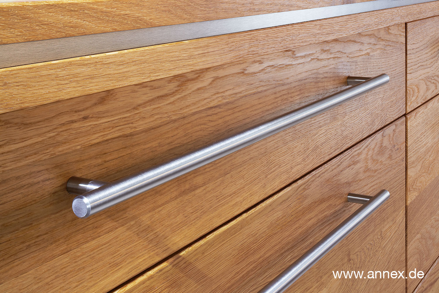 Der handgefertigte Griff aus Edelstahl ist nicht nur ein Gestaltungselement der annex Holzküche. Er liegt auch sehr angenehm in der Hand, um Türen und Schubladen ganz einfach zu öffnen.