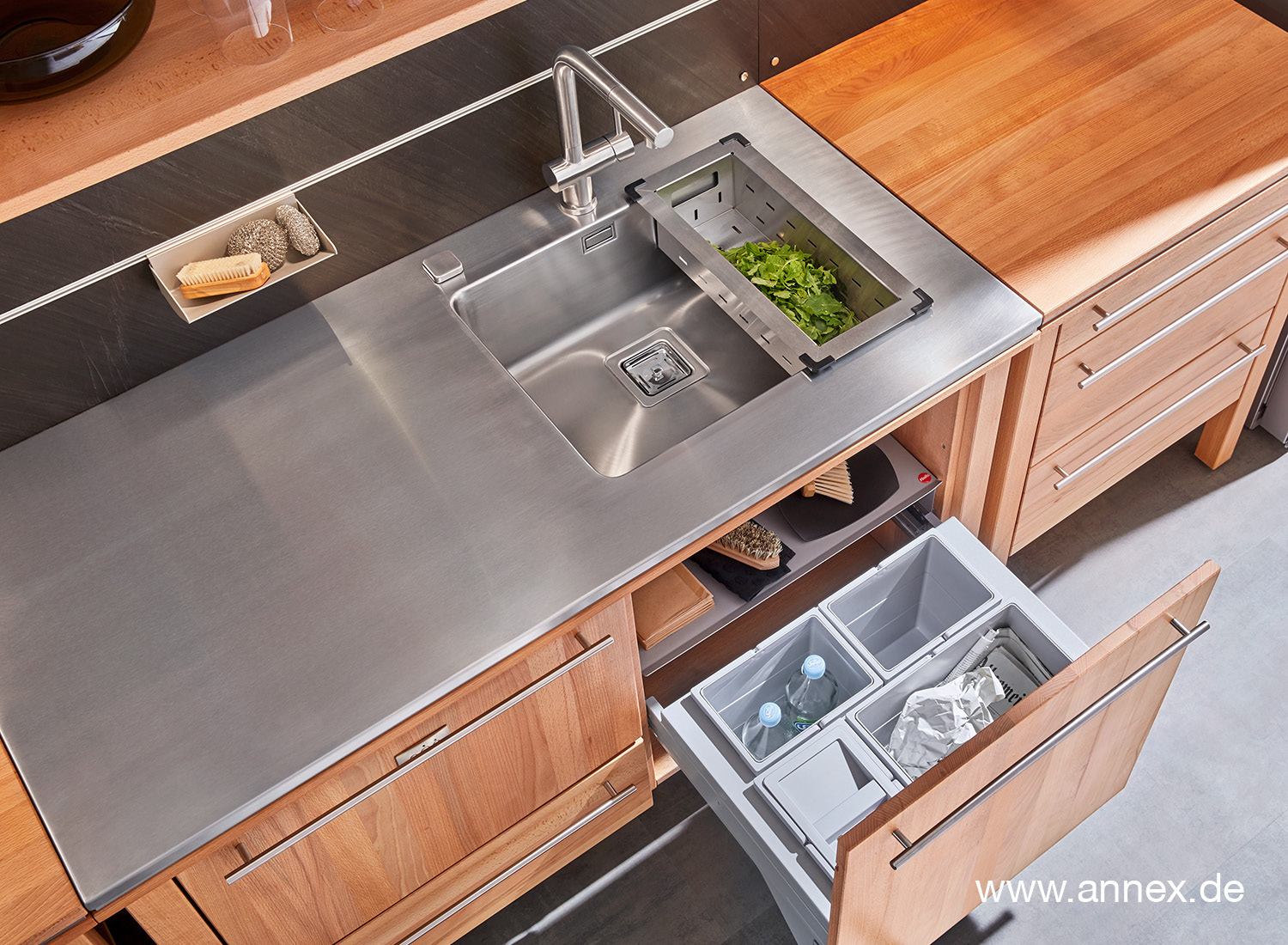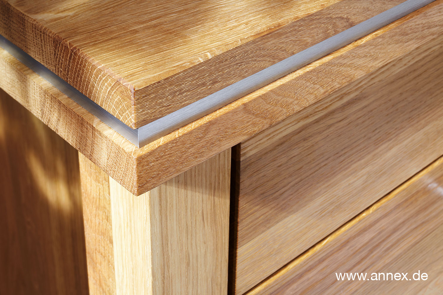 Das umlaufende Edelstahlband der Arbeitsplatten und die Edelstahlstangengriffe unterstreichen die klare Linienführung und machen die annex Massivholzküche unverwechselbar.