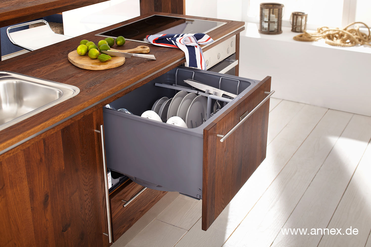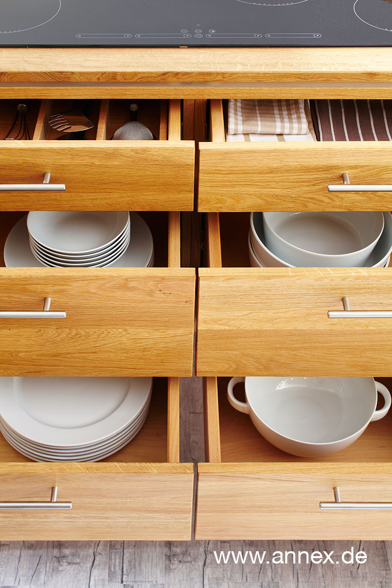 Ebenfalls komplett aus Massivholz sind die geräumigen Schubladen ausgeführt. Gelagert sind diese Vollauszüge auf leichtlaufenden Führungen mit einem sanft gedämpften Selbsteinzug.