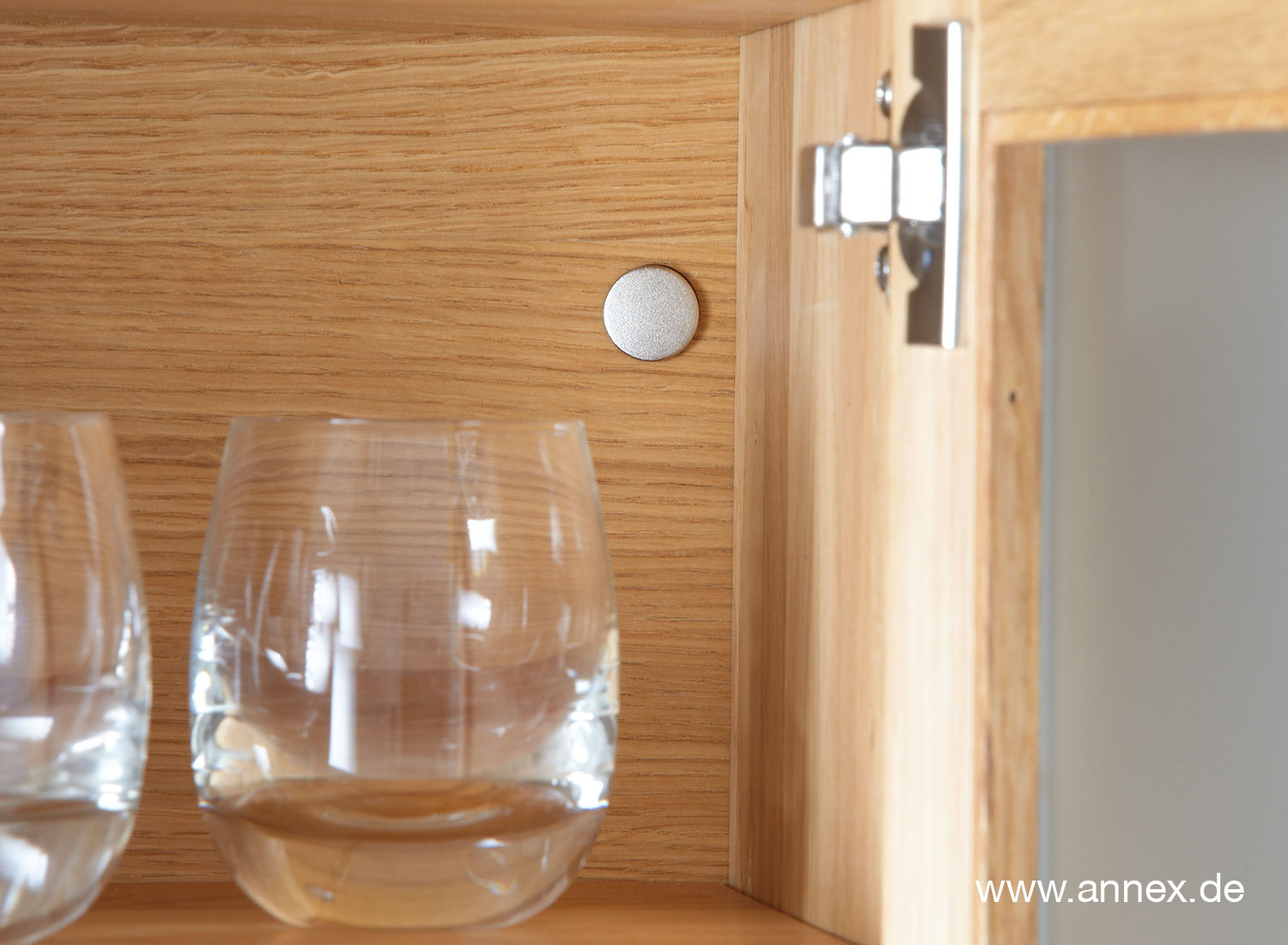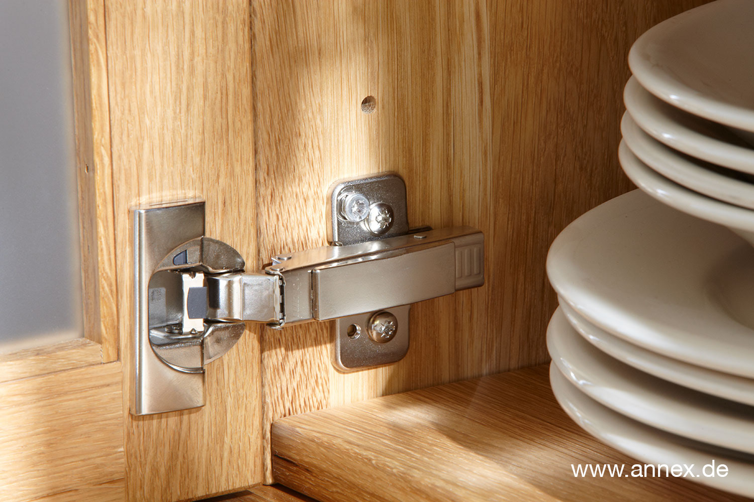 Dank des komplett aus Metall gefertigten Türscharniers öffnen Sie die Türen der Massivholzküche angenehm leicht. Und eine extra Dämpfung sorgt für sanftes und flüsterleises Schliessen.