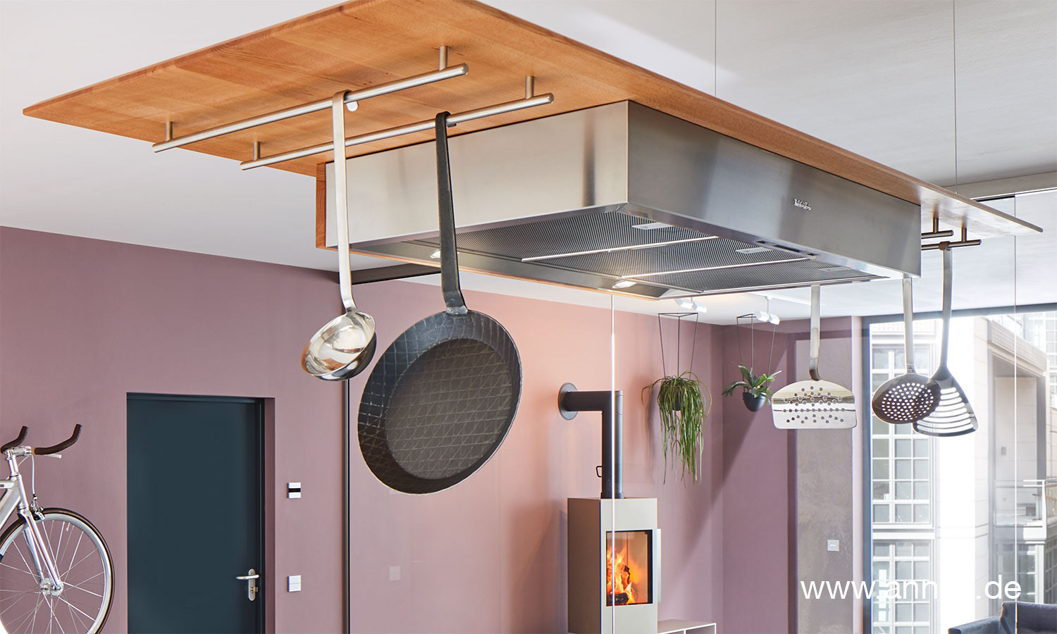 Inselhaube mit Relingstangen zum Aufhängen von Küchenutensilien. Dünne Drahtseile lassen die Haube über dem Kochmodul „schweben“.