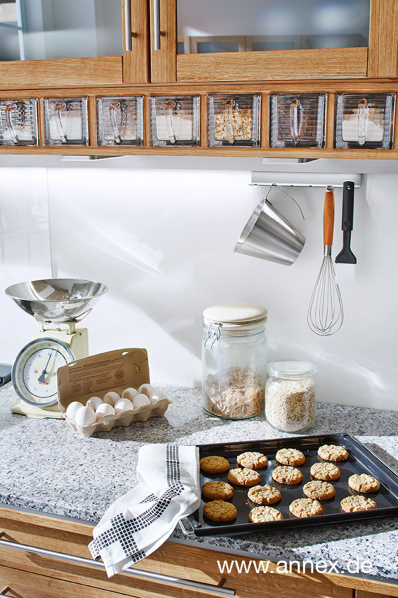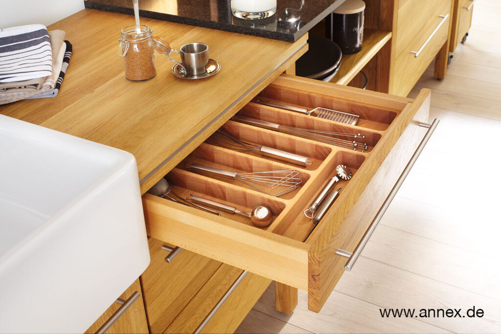 In dem aus einem Holzstück gefrästen Besteckeinsatz lagern Ihr Besteck und Ihre Küchenhelfer sehr übersichtlich und immer griffbereit.