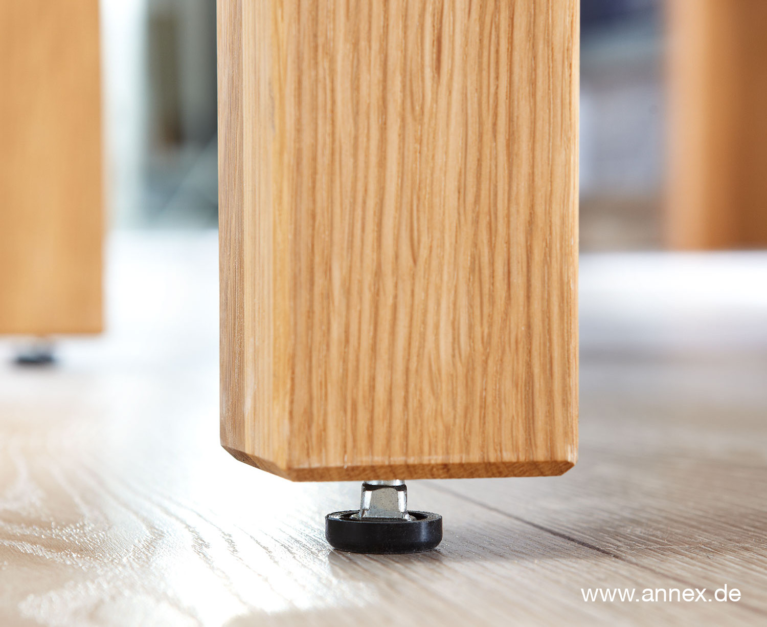 Der in den Stollen integrierte Höhenversteller unserer Modulküche gleicht Unebenheiten bis 3 cm problemlos aus.