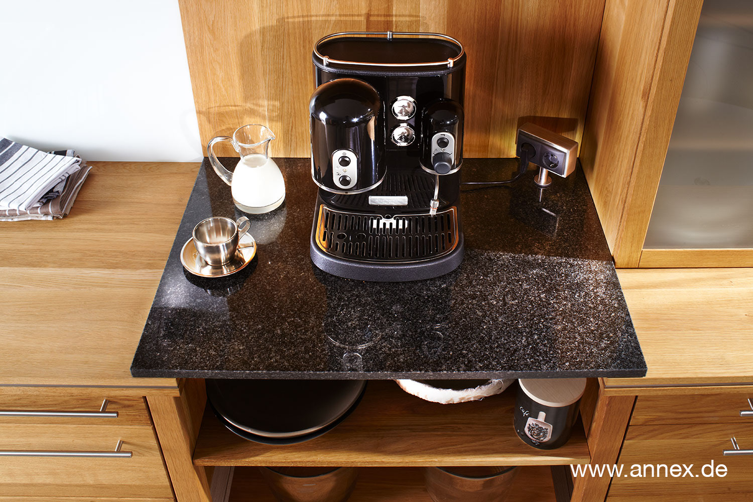 Wenn Sie zwei Küchenmodule mit einem Verbindungselement aus Granit verbinden, erhalten Sie einen idealen Platz für eine Kaffee- oder Küchenmaschine.
