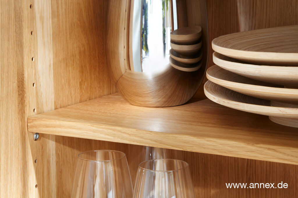 Alle Bauteile unserer massiven Modulküche sind aus 19 mm dickem Holz ausgeführt. So trägt der in der Höhe verstellbare Einlegeboden auch problemlos schwere Küchengeräte.