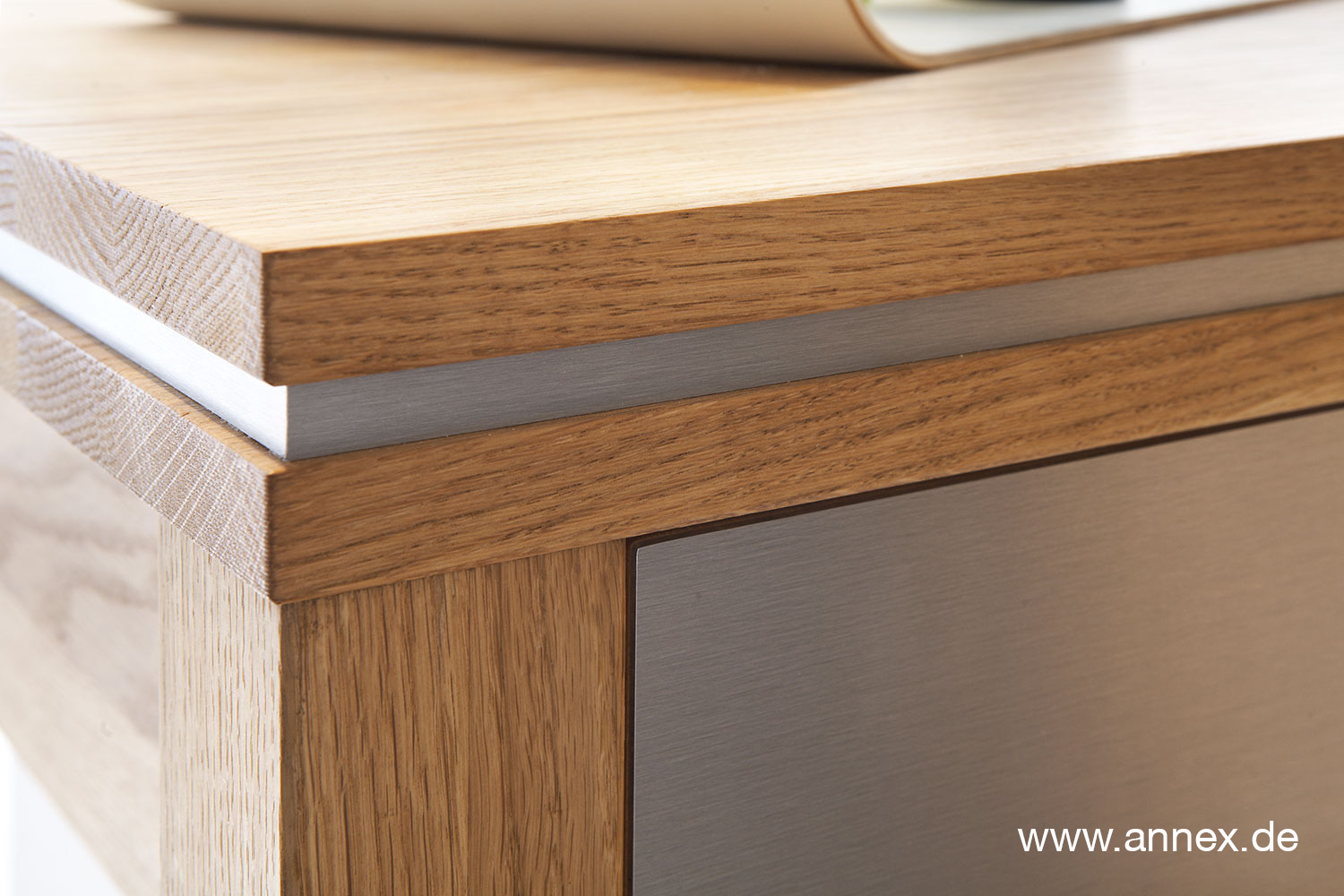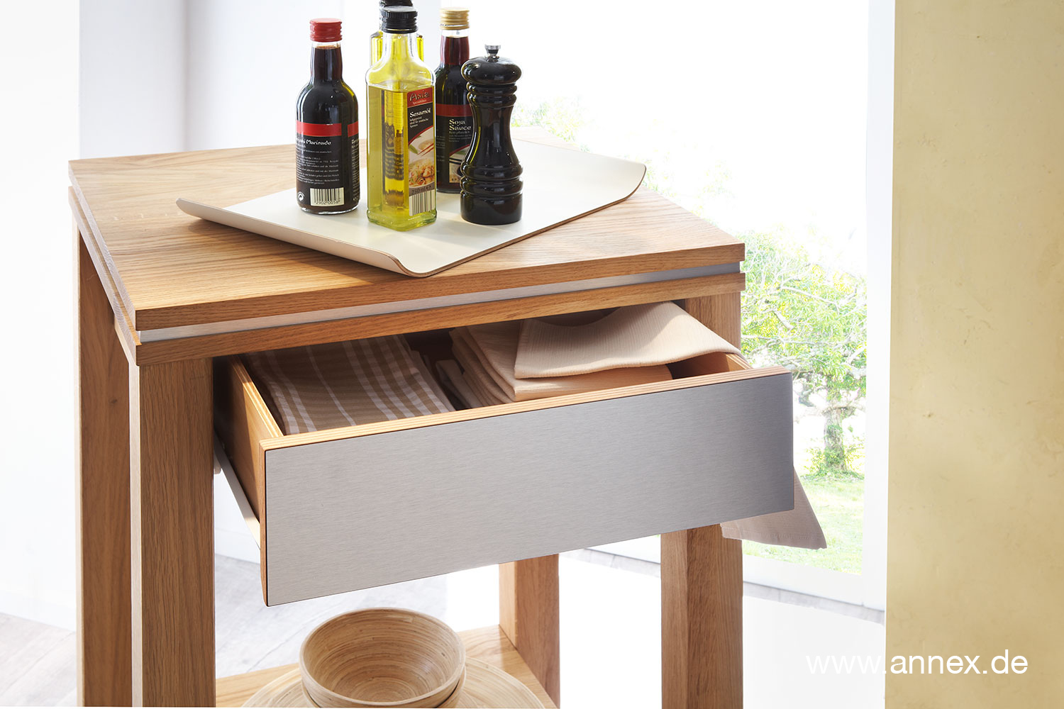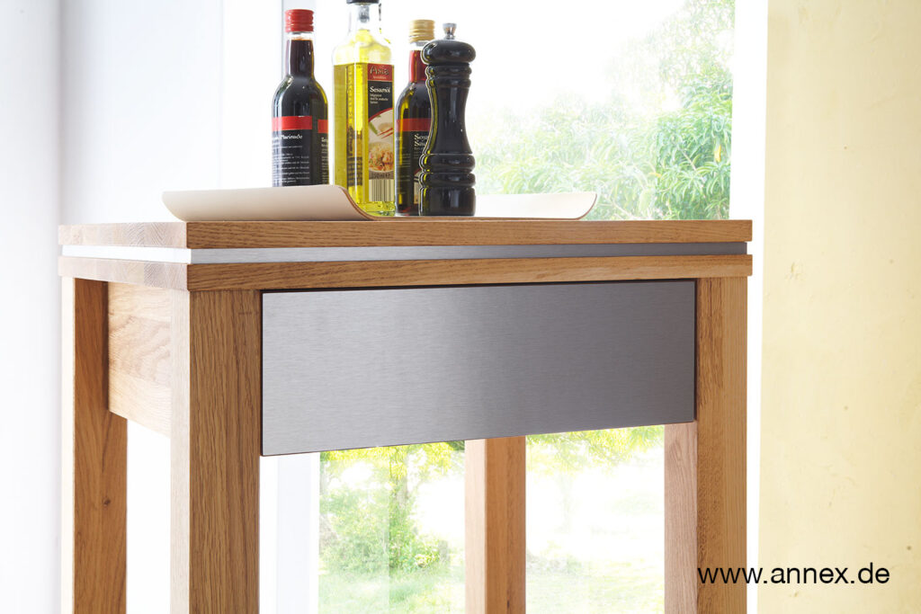 Denn auch er hat die typische Arbeitsplatte aus Buche oder Eiche