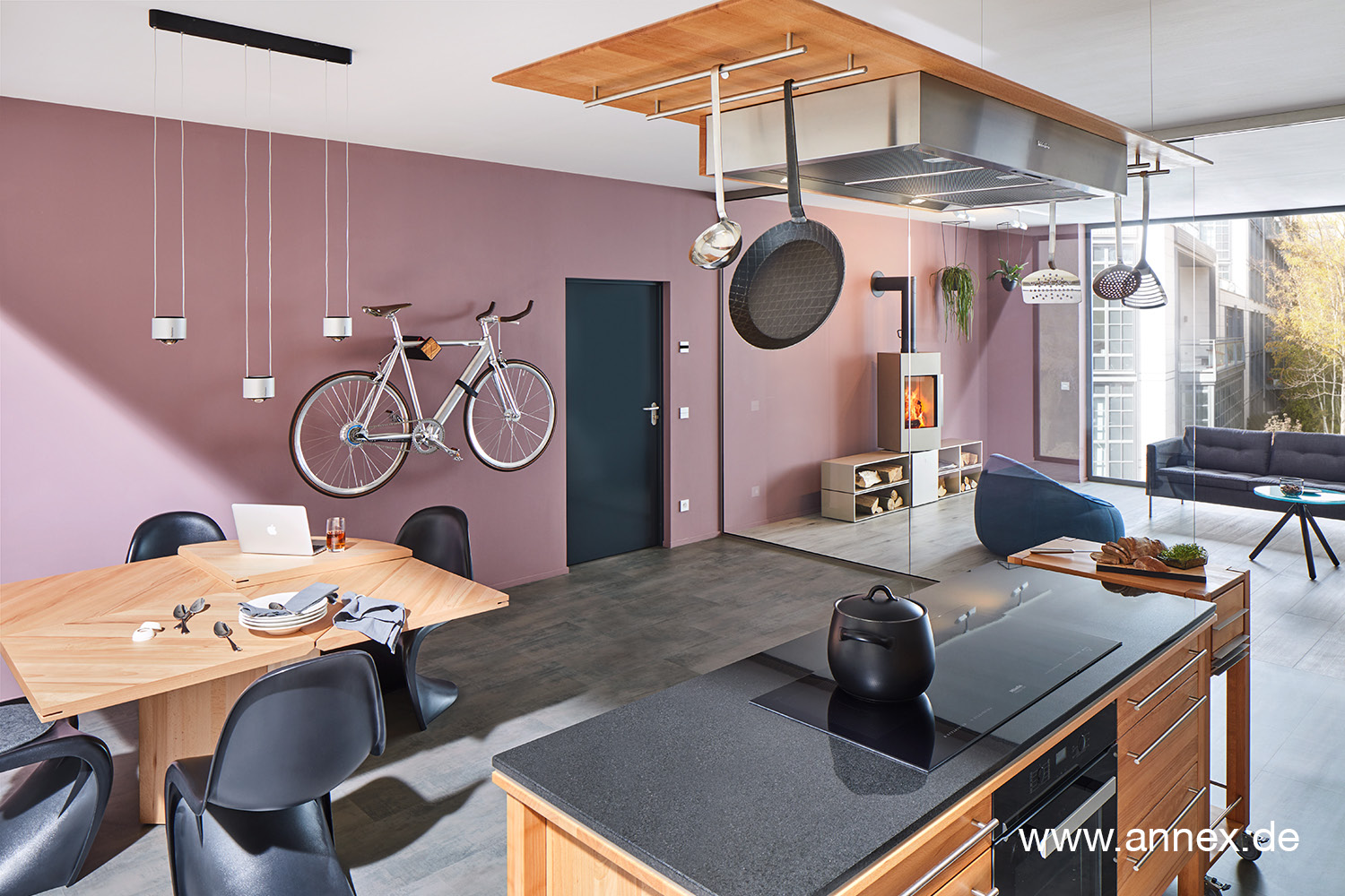 Frei und völlig schwerelos schwebt die Inselhaube nebst ausgesuchten Küchenutensilien über der Kochinsel. Massivholz und unsichtbar feine Seile sorgen für den Befreiungsclou.