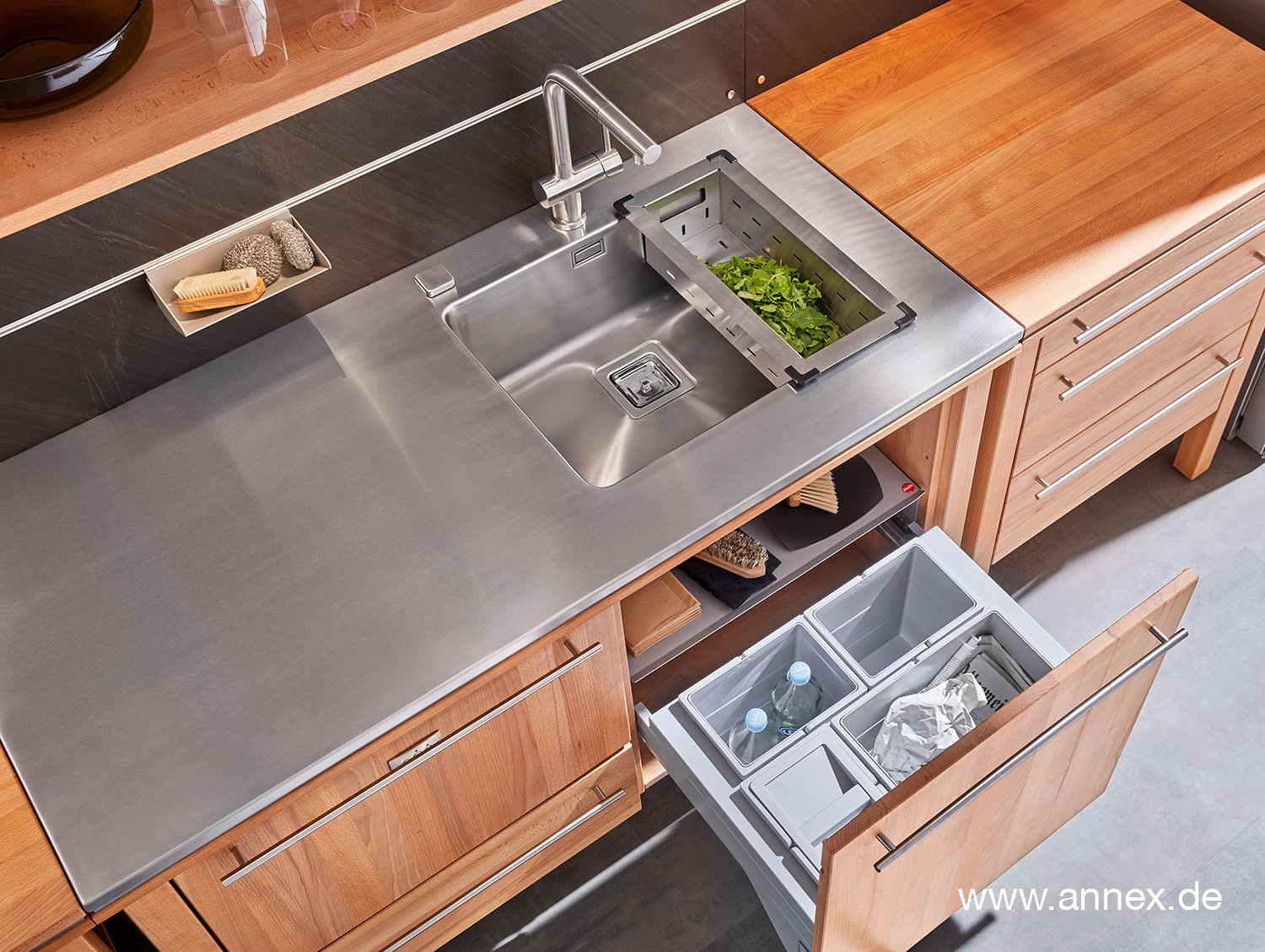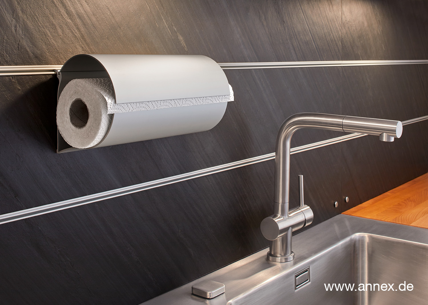 Die unendliche Küchengeschichte. In die praktischen Aluminium Schienen lassen sich verschiedene Ordnungssysteme einfach einhängen.