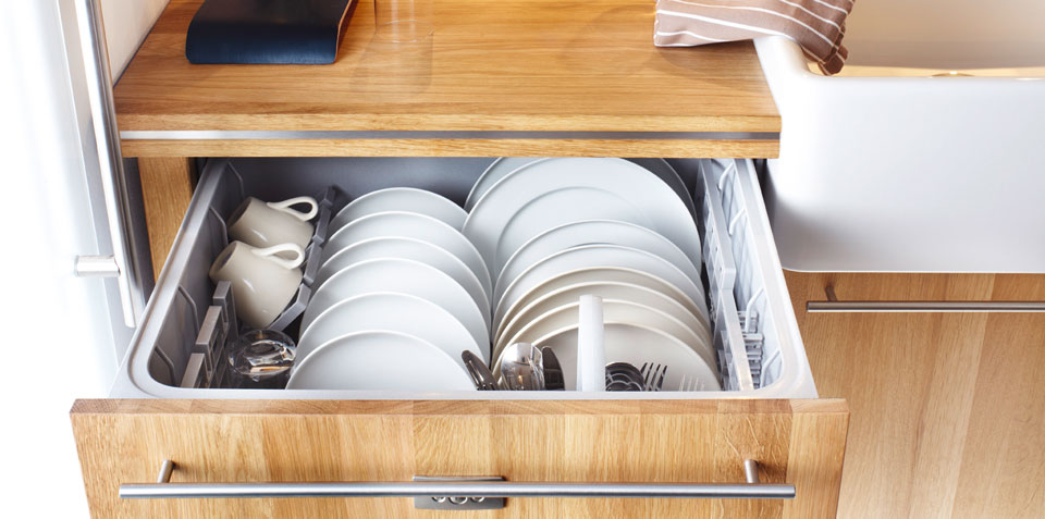 Sauber, sauber – und elegant gelöst: in einer Schublade verbirgt sich eine Mini-Spülmaschine … in genau der richtigen Größe für den kleinen Haushalt.
