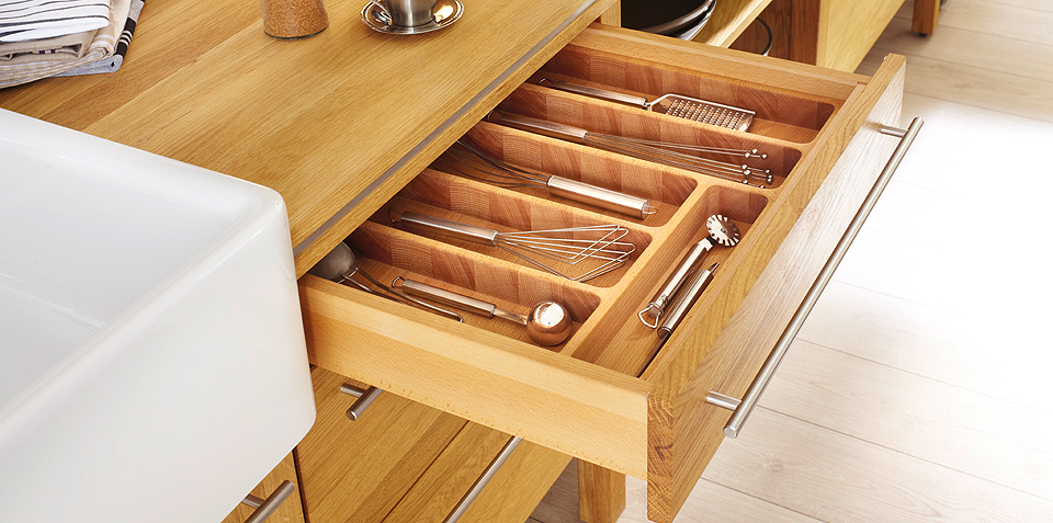…flankiert von zwei Schubladen-Adjutanten, die optisch und haptisch den Massivholz-Kontrast addieren. Das bringt den Flair der Abwechslung in jede Küchenlandschaft.