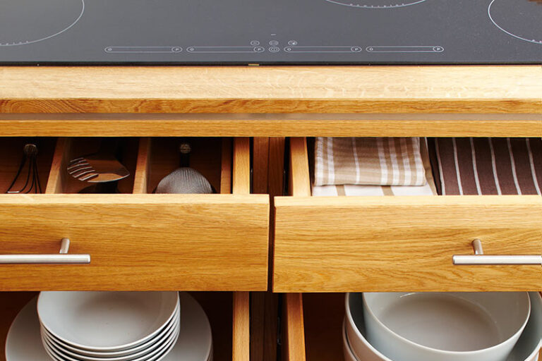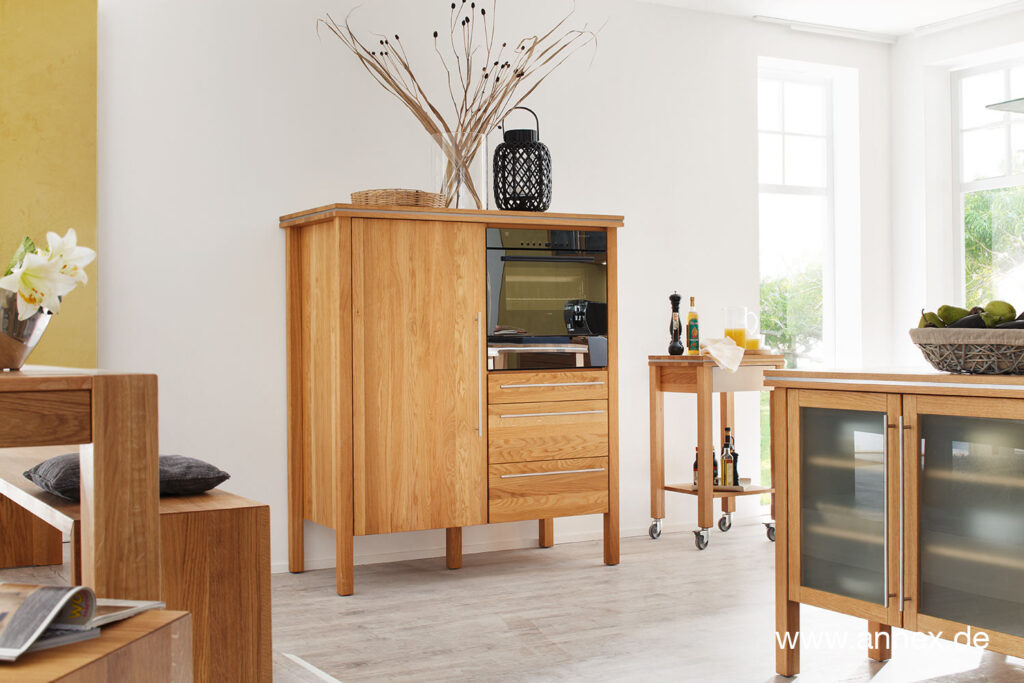 Dieser Hochschrank hat´s in sich: nämlich einen Backofen und hinter der massiven Holztür einen geräumigen Kühlschrank.