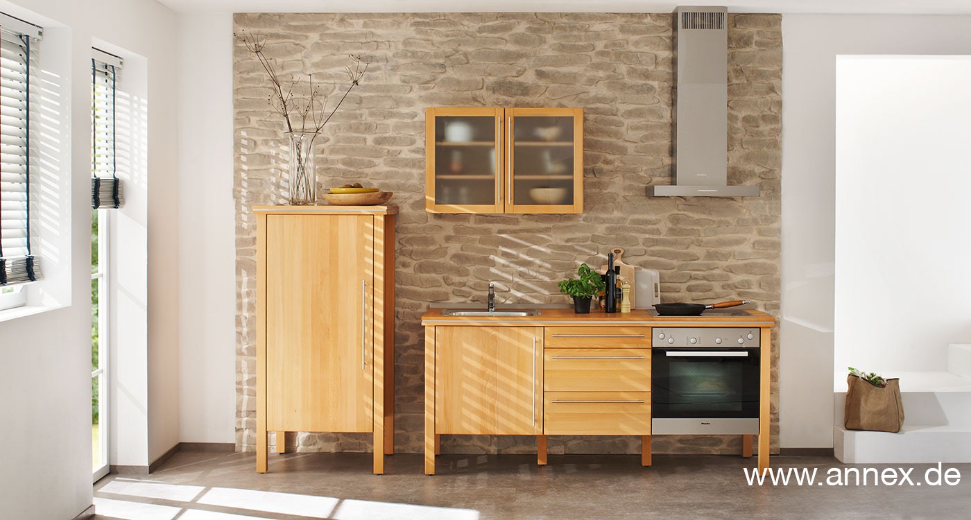 Früher wurden kleine Küchen als Miniküche oder auch als Pantryküche bezeichnet. In den letzten Jahren setzt sich die Bezeichnung Singleküche immer mehr durch. Passend zu unserer mobilen Gesellschaft lässt sich diese beim nächsten Umzug ganz einfach mitnehmen. Dabei ist diese nicht nur für kleine Haushalte ideal. Auch in Ferienwohnungen und Büros findet diese Verwendung.Der große Vorteil unserer Naturholzküche ist die optische Wirkung eines Einzelmöbels und nicht einer klassischen Küche.