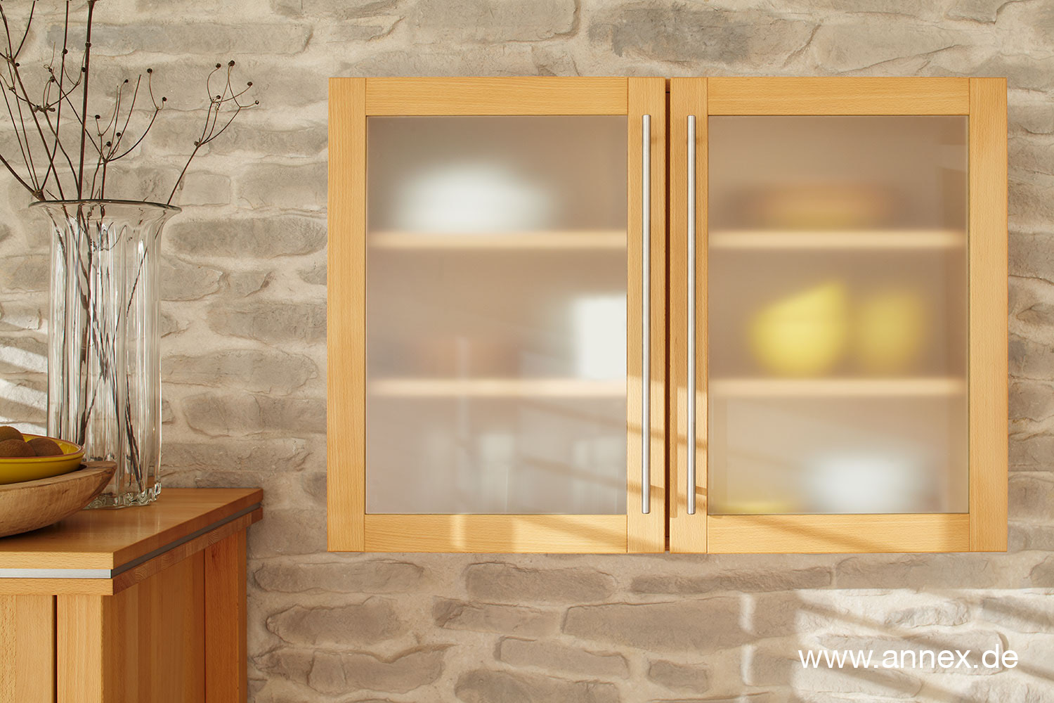 Wandschmuck, der sich nützlich macht? Warum nicht, wenn es sich dabei um unser Massivholz Hängeschränkchen mit satinierten Glasscheiben handelt.