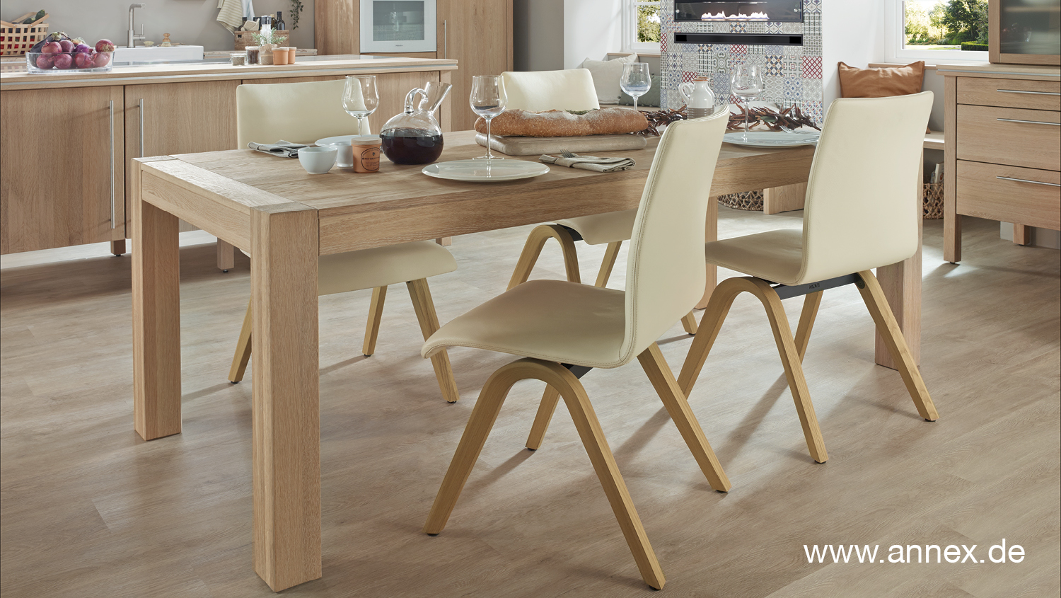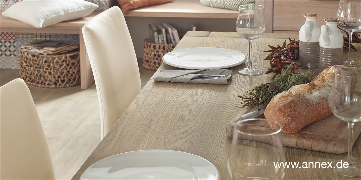 Tischlein deck dich sehr apart – und ganz ohne Tischdecke. Wäre doch schade wenn man die weiß lasierten, feinen Maserungen einfach zudecken würde.