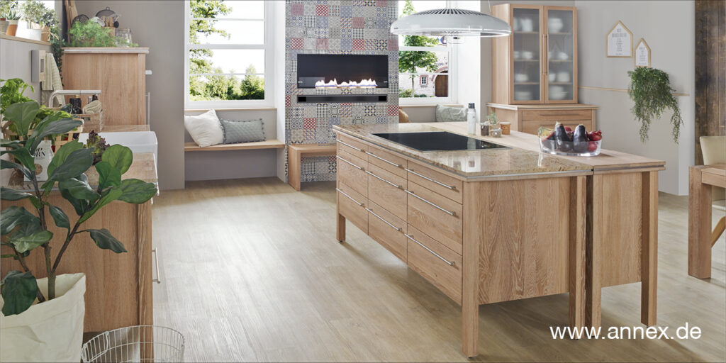 Dick auftragen war noch nie unsere Sache. Lieber ganz fein ´drüber. Das gilt für die Kochinsel aber auch für die Peripherie mit Schränken, Esstisch und Vitrinen.