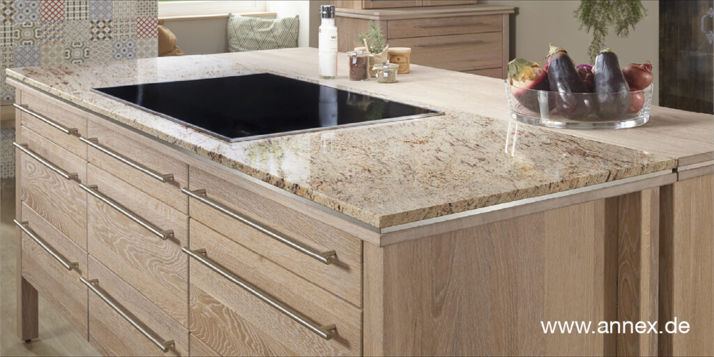 Von nahem betrachtet, springen die reizvollen Kontraste ins Auge. Das Close-up zeigt edle Gegensätze auf: das Ceran-Feld in schwarz, die Granitplatte in anmutigen Karamelltönen, die handgefertigten Griffe aus mattglänzendem Edelstahl.